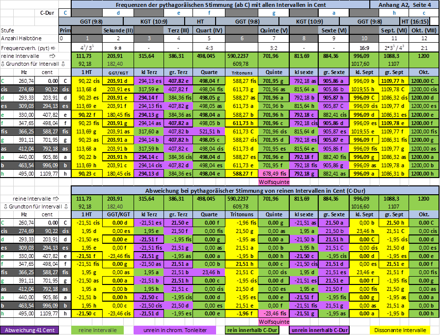 A 2-4 Frequenzen der pythagoräischen Stimmung in C-Dur mit allen Intervallen und Abweichungen in Cent