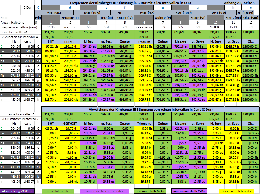 A 2-5 Frequenzen der Kirnberger III Stimmung in C-Dur mit allen Intervallen und Abweichungen in Cent