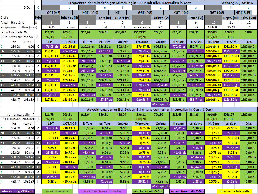 A 2-6 Frequenzen der mitteltönigen Stimmung in C-Dur mit allen Intervallen und Abweichungen in Cent